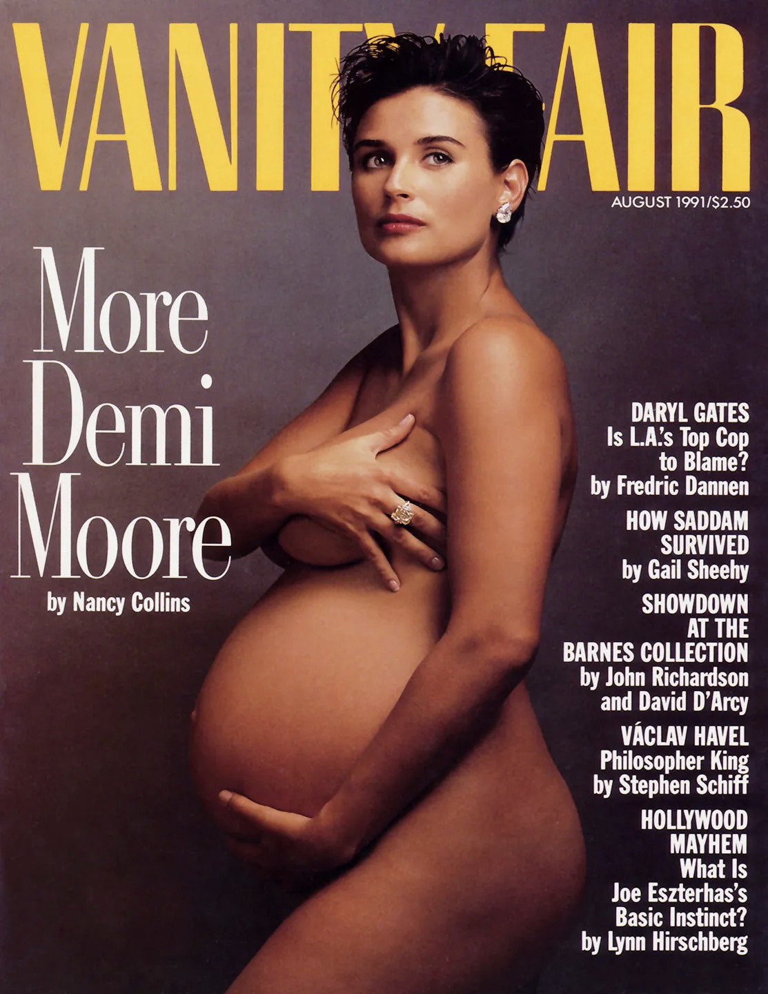 1991年,28 歲的 Demi Moore 以懷孕的姿態登上《Vanity Fair》雜誌封面,毫不掩飾自己的孕肚,照片在知名攝影師Annie Leibovitz 的捕捉下也光彩動人,這樣的舉止卻在當時備受爭議。Demi Moore 多年後受訪時說:「我理解到那些照片對世界有著怎樣的影響。對女人而言,這像是允許了我們能擁抱懷孕的自己。那一刻,我真的可以做自己了。我也意識到從那之後,我開始能逐漸接受自己是什麼樣的人。
