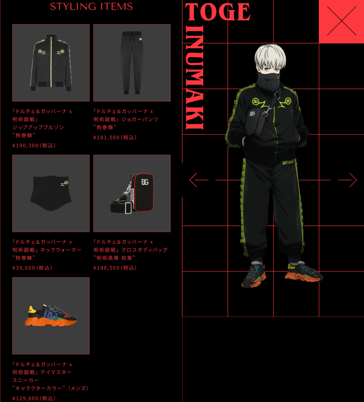 Dolce&Gabbana 為 1985 年 Domenico Dolce 與 Stefano Gabbana 所成立的時裝品牌。從古至今風格也相當一致,自最初受折中派和簡約商店波希米亞風的影響,以深色、動物紋設計的「高級嬉皮士風」,到現在一向都以用「奢華」設計風靡全球,所以在確定與《咒術迴戰 Jujutsu Kaisen》聯名後,著實為品牌帶來不少討論熱度。