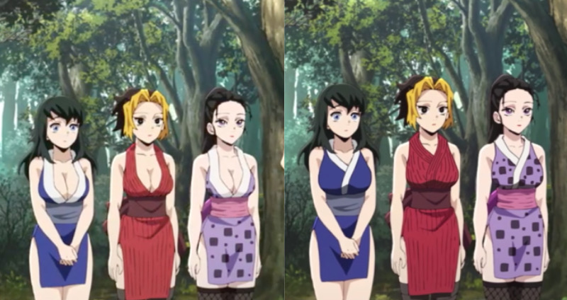 在原版《鬼滅之刃遊郭篇》中,音柱宇隨天元的三個老婆的身材都相當性感,在原版動畫中的穿著更是凸顯了其身材的火辣,不過這身衣服在 bilibili 版的動畫中,把原先的低胸上身衣服包得緊實嚴密,遮住了原先三位女忍者的乳溝。不過這修改的可以說是相當有心了,一般來說可能會直接剪掉畫面,或修改分鏡,再不然就直接打碼(這樣好像會更奇怪?),把原先的服裝重新繪製應該是比較麻煩的選項了,為了不影響劇情又能上架也真是辛苦。