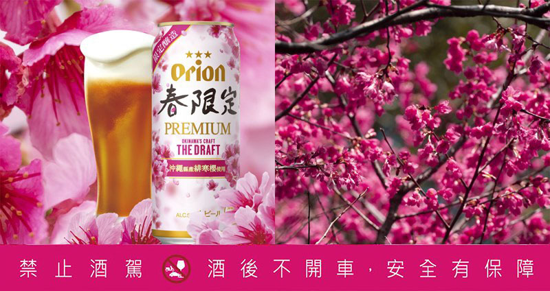 沖繩Orion奧利恩生啤酒—春限定罐,原料全都源自沖繩在地,特有的「琉球緋寒櫻」乾燥花瓣,融入伊江島產大麥、稻米及山原淨水,呈現有如夕陽渲染般的嫣紅色澤。其馥郁的口感,尾韻淡淡的櫻花香氣,引領品飲者回憶沖繩的春季浪漫印象。