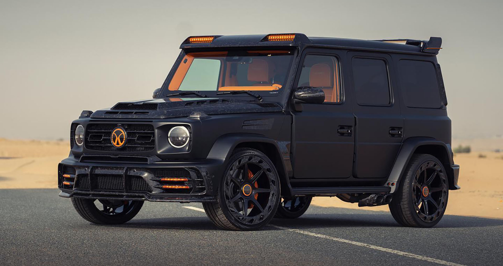 引自 Mercedes-AMG G 63 的基礎,和 Mansory 在 2021 年所推出的 Gronos 套件進行微調,可以見到這全名為「Gronos Evo S P900」的全新車款有著截然不同的空力套件,舉凡前後保桿、水箱護罩、引擎蓋、側邊葉子板,甚至到車頂上的探照燈、擾流尾翼,以及備胎蓋等等,全數都是使用鍛造碳纖維製成,黑色基底搭配亮橘色還真的有夠低調。
