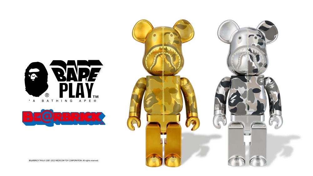 Bape® 與 MEDICOM TOY 旗下 BE@RBRICK 再度推出全新系列,其中包含 A BATHING APE®︎ 經典的標誌性鯊魚圖案,可以清楚的在 BE@RBRICK 公仔上看見 BAPE®︎ CAMO 覆蓋著全身。這回一共推出金、銀兩種配色供各位選擇。尺寸上有 1000% 及 400%+100% 可選擇,價格分別為 NT$ 51,199 及 NT$9,599 。此次聯乘系列將於 2022 年 6 月 4 日(星期六)於 Bape® 台北專門店正式發售。有興趣的朋友千萬別錯過!