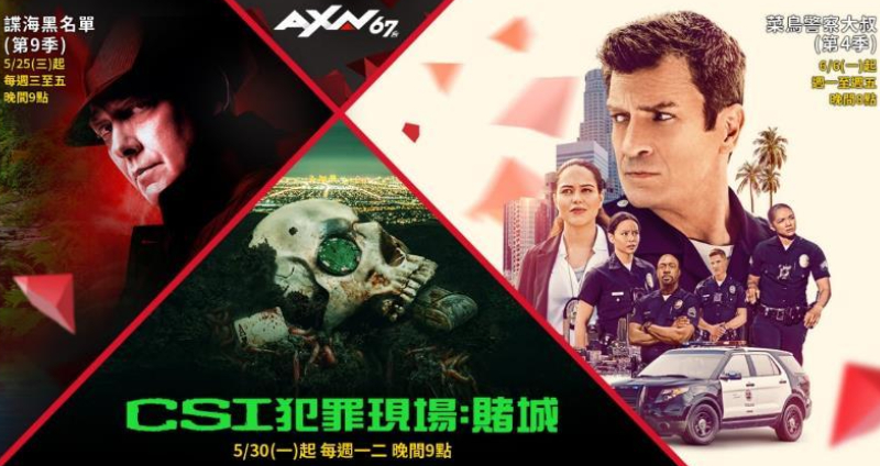 此外,AXN 67 頻道同步推出多部強檔影集,5 月 23 日起每週一至五晚間 8 點,改編自 1977 年經典同名美劇《夢幻島》、5 月 25 日起每週三至五晚間 9 點,由艾美獎視帝詹姆斯史派德完美詮釋的犯罪翹楚「紅爺」,將帶領《諜海黑名單》全新第九季精彩回歸。還有 6 月 6 日起每週一至五晚間 8 點,充滿趣味的警匪動作影集《菜鳥警察大叔》全新第四季將接續播出,看成功躍升巡警的主角「約翰諾蘭」與全新角色 FBI 聯邦調查局「席夢」,兩位「最老菜鳥」會碰撞出精彩火花。