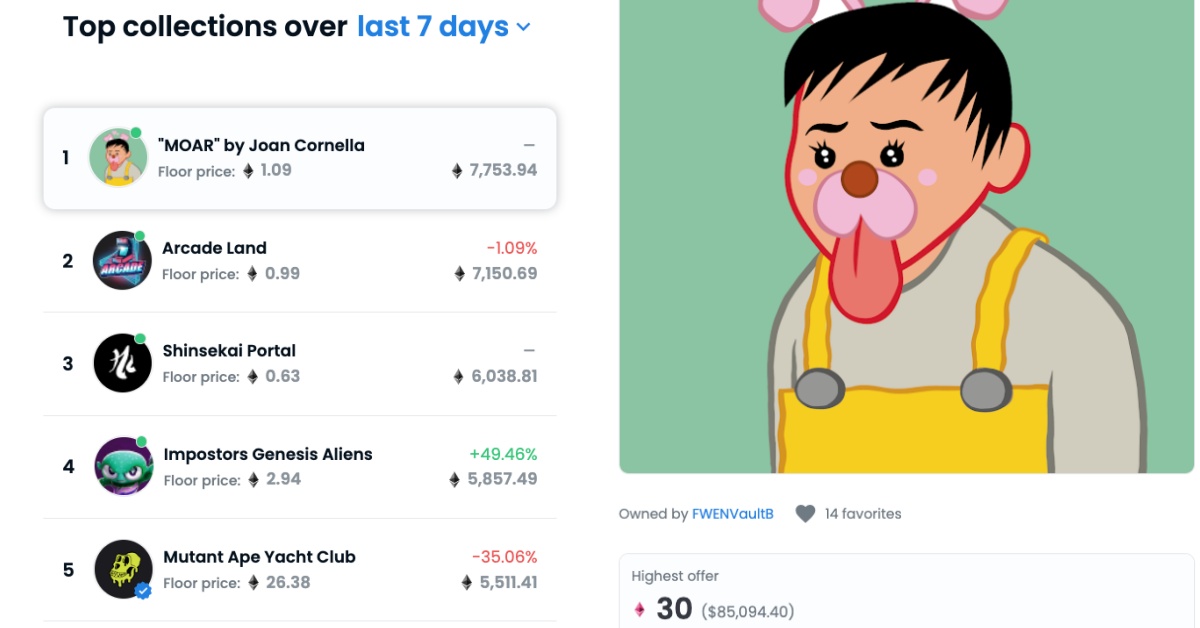 延伸閱讀:眾星齊曬!重磅 NFT 項目《MOAR BY JOAN CORNELLÀ》熱爆開箱,7日成交量超越 BAYC、Azuki !