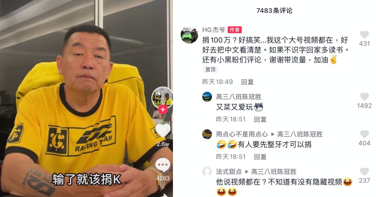 沒想到 HG 杰爺至今堅持不認帳,稍早甚至在最新上傳的影片的留言區回應網友:「捐 100 萬?好搞笑⋯⋯我這個大號視頻都在,好去把中文看清楚。如果不識字回家多讀書。還有小黑粉們的評論,謝謝帶流量,加油」讓網友們群情激憤,還有人發現他把一些證據影片都刪了,認為他才是真的口嗨王、縮頭烏龜。