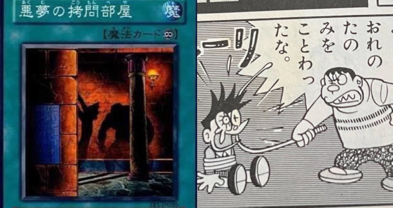 一月推出的卡牌收藏對戰遊戲《遊戲王 Master Duel》成功地讓《遊戲王》系列熱度上升,全球更是有超過千萬玩家下載遊玩,而近日有名日本網友デライ在超過上萬張的卡池中意外發現「惡夢拷問部屋」這張卡片中的剪影畫面活像《哆啦A夢》中的胖虎在對小夫 SM 的惡搞迷因,他將該發現上傳至推特後造成網友們間的大量迴響,獲得超過萬名網友的愛心與轉推,大家更大喊:「我不對勁了。」,還有網友將推主腦內的畫面直接 PS 出來,簡直笑到不能自已!