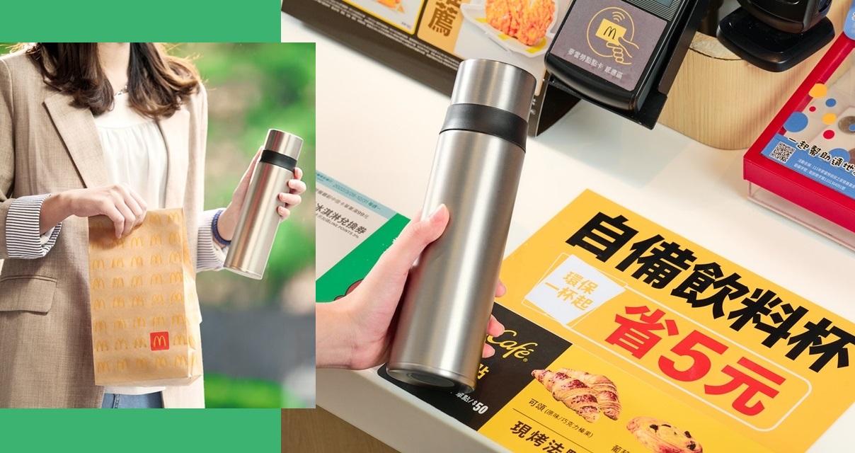 環保一杯起!麥當勞為鼓勵消費者自備飲料杯,6 月 1 日起凡消費者自備飲料杯至麥當勞購買飲料,無論大中小杯,皆可現折 5 元,希望透過即時的現金折抵回饋,減少一次性廢棄物。