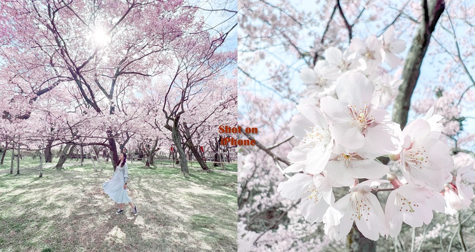 「兩小口」於滿開期間的平日早上 8 時多到達高遠城址公園,幸好遊客不算太多,能夠在遷就角度下拍出無人花海!Eri 認為 iPhone 13 Pro 系列非常適合於花景,她認為在構圖和取景方面,iPhone 的三相機系統帶來極大的空間和可能性,例如超廣角相機可以輕易拍出一望無際的視覺效果。Eri 表示:「對女生來說,超廣角鏡頭的邊緣位置易有『 延伸效果』,影人的雙腿看上去便特別修長;而將攝影主角置中也會令周圍景物向外延伸,加上行進櫻花樹的背面,可帶出一點點不一樣的動感。」