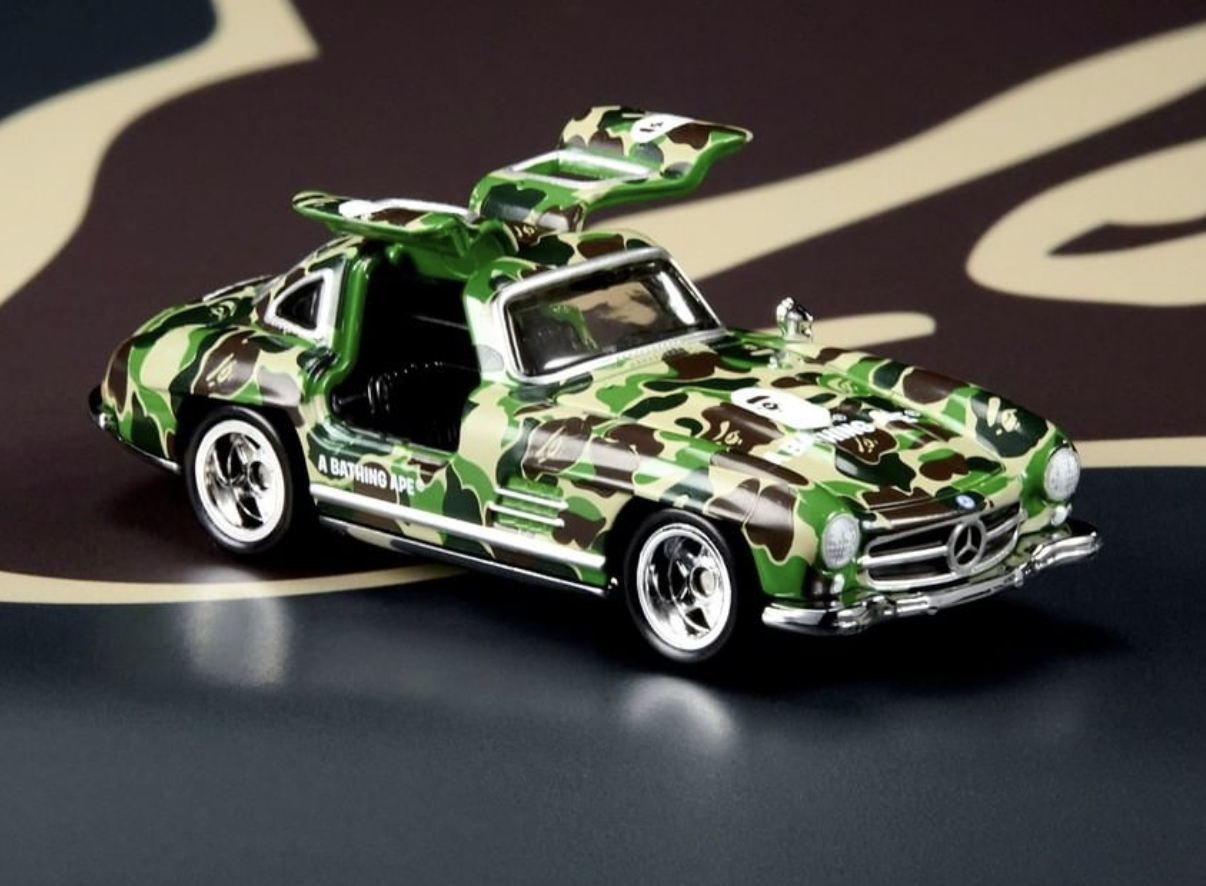 Hot Wheels 小汽車此回攜手 BAPE 合作,選用 Mercedes-Benz 300SL 車型,在車身外觀選用草綠色,搭配經典 BAPE 迷彩拉花,並在引擎蓋、車門兩側印上猿人頭 Logo,最後,車牌處寫上 BAPE 字樣,以作為合作象徵。
