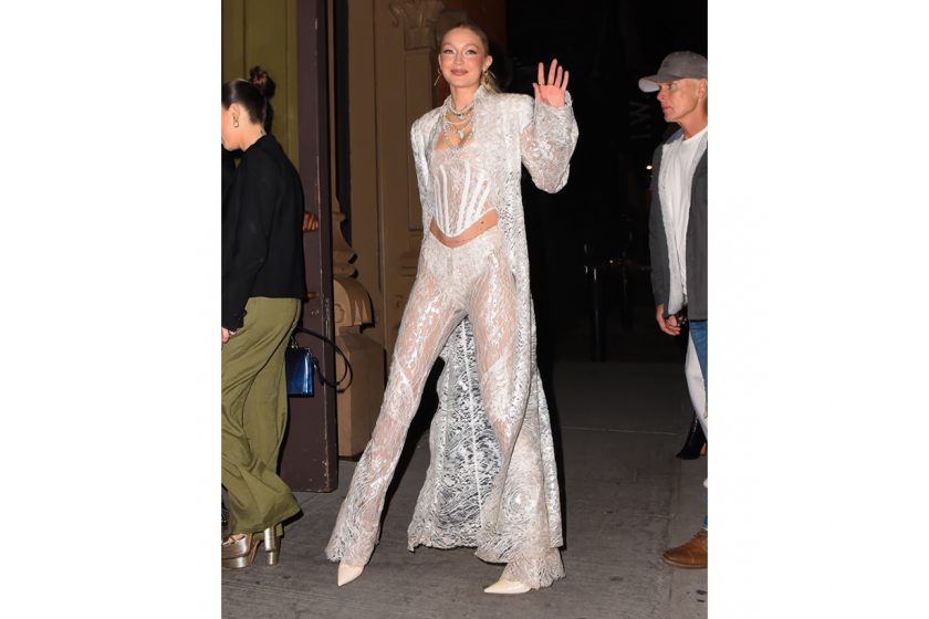 最盛裝打扮的自然就是壽星 Gigi Hadid 了,身為這個世代的超模,Gigi Hadid 穿過各大品牌的服裝、高級訂製服,在這個對自己重要的日子裡,她選擇了近年來在時尚圈大熱的 Dion Lee。Dion Lee 來自澳洲,將幾分仙氣柔和幾分火辣,這個看似衝突的風格完美結合,Gigi Hadid 的蕾絲馬甲、透膚長褲、內搭短褲、落地墊肩的外套,一氣呵成撲滿了細緻精美的蕾絲,搭配 Jacquie Aiche 滿分貴氣的珍珠項鍊,十足像個女王無誤!