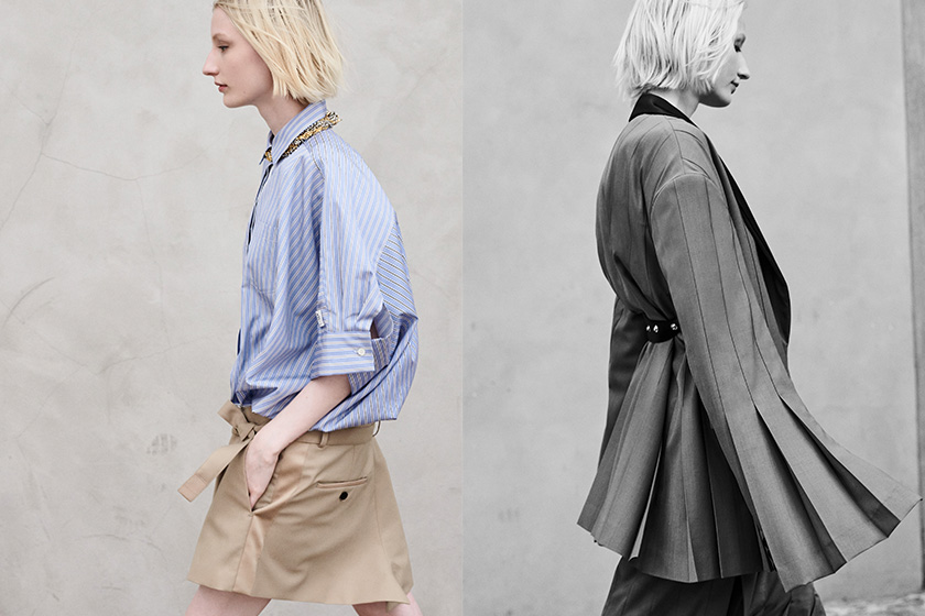 在 sacai 的設計語言中不可或缺的褶皺元素,本季也依舊頻繁登場,值得矚目的融入了男裝的大膽設計中,從傳統女性化的表達中釋放,得到讓人耳目一新的亮點,而在女裝中,則透過層次堆疊將褶皺變化多端的運用,另外塗鴉大師 Eric Haze 的“One Kind Word” 和 “As One” 以裝飾性印花和刺繡呈現,在足上更不能錯過 sacai x Clarks 聯名推出的厚底 Wallabee 鞋款,概覽整個系列後,又再次令人目光停留!