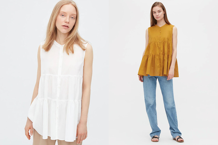 這款無袖棉質抓皺上衣被不少日本女生形容為「小肚腩救星」,採用 100% 棉質製成,輕盈舒適,無袖款式尤其適合炎熱的夏季穿著。這款上衣最大的特點落在了抓皺的蛋糕拼接設計,為衣服增添了空間以及飄逸的感覺,完美遮蓋了小肚腩,瞬間顯瘦!這款抓皺上衣共有三種顏色可供選擇,分別是白色、黑色以及芥末黃。