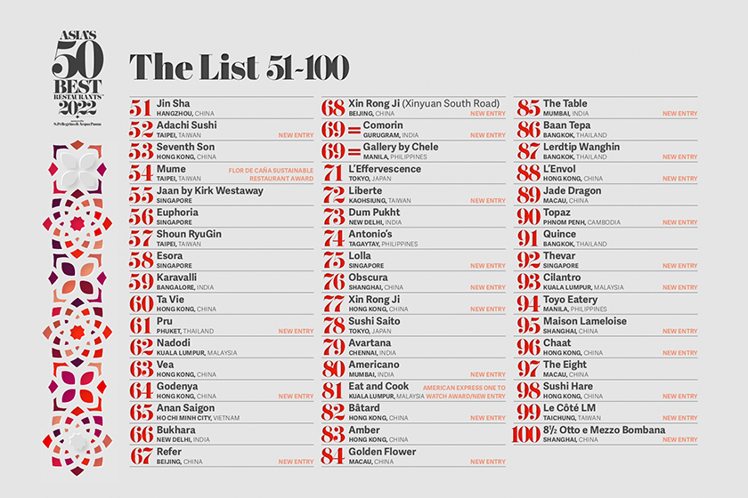 此外也有多間知名餐廳在今年首次登上榜單,包括新加坡廣受歡迎的 Lolla、在印度備受好評的 Comorin、Americano 和 The Table 均是首次入圍,柬埔寨的精緻餐廳 Topaz 也在 2022 重返榜單,另外台灣上榜的 5 間餐廳,則包括受到米其林肯定的 Mume、祥雲龍吟,而號稱最難訂位的日式料理足立壽司,更是榮獲排名最高的新入圍餐廳,在揭曉前 50 名單之前,不妨先將以下這些百名內的餐廳筆記起來!