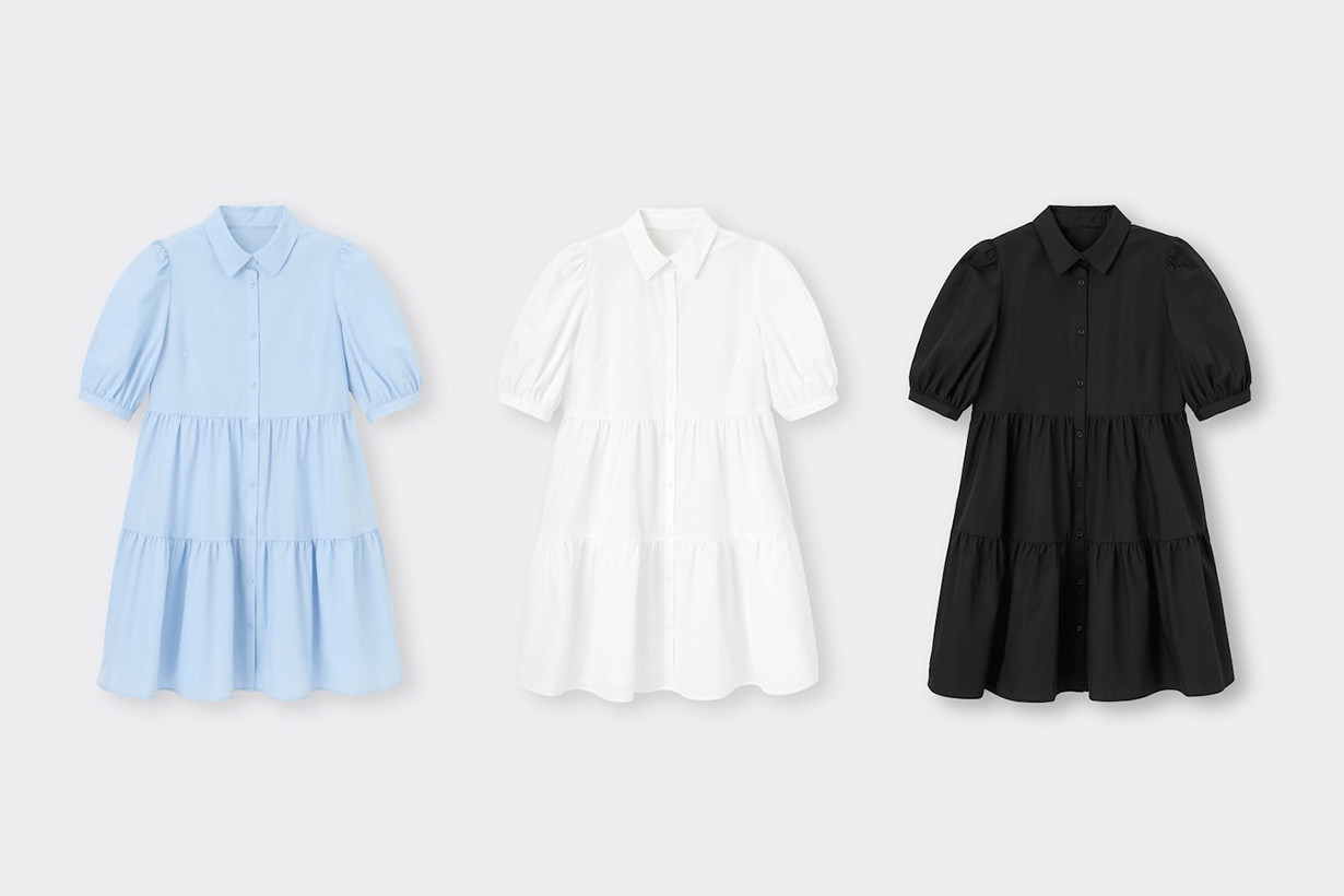 GU 以前扣式的襯衫領搭配層層的蛋糕裙擺、澎澎的五分公主袖,整體看似柔美少女感,卻能讓你搭配不同配件、飾品來轉換不同個性,目前推出有天藍與黑白兩色的連身裙,裙裝本身有附上內裡的襯褲避免走光,可以單獨穿著露出纖細長腿,以帽款、長靴與手袋為亮點,也可以搭配短褲呈現俏皮感的穿搭,不少日本女生也會換上寬擺的丹寧長褲和跟鞋,打造俐落的上班造型。