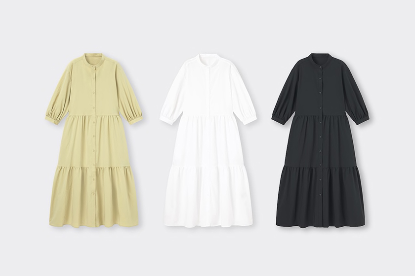 這件 GU 的前扣式的開襟連身裙,不僅以多層的蛋糕裙擺帶來飄逸感,能夠搭配毛衣、針織背心等冬季單品做出層次穿搭,也可以在氣溫回暖時單獨穿著,或者作為長版罩衫來搭配丹寧褲、T-shirt 等休閒單品,除了備受歡迎的黑白兩色,帶有輕盈感的淺芥末黃色更十分適合春日造型!