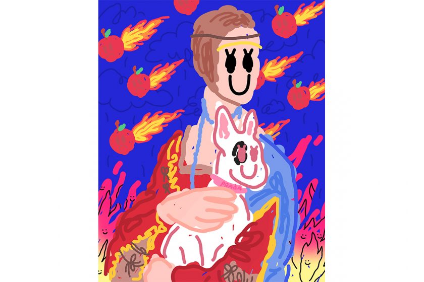 《I’m PRADA you》-此作品致敬 Leonardo da Vinci 於西元 1489 年所畫的《Lady with an Ermine》,以富有現代語彙的物件置入其中,畫面當中墜落的蘋果、斷訊藍屏上的暴雨,反應現代社會的「快」與「雜」,也正因這些紛亂的存在,凸顯前方女子與狗的平靜和諧。