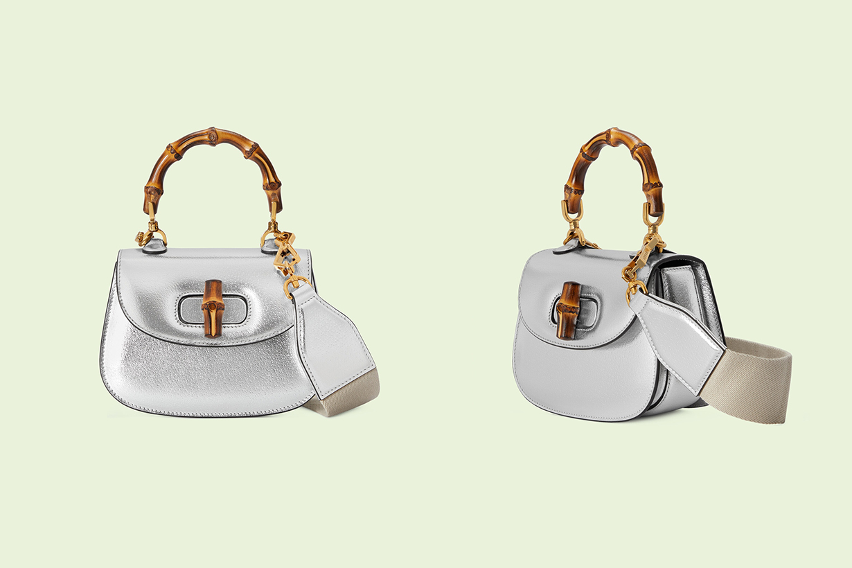 這款為人熟悉的 Jackie 196 1手袋在今季再次成為焦點,以耀目的金銀線皮革製作帶出 Jackie 1961 金銀線迷你袋,這個經典款式更加入了另一條可拆式 Interlocking G 鏈條肩帶,為作品增添了當代氣息之餘,亦帶來了全新攜帶方式,自由變換手挽、肩揹以及斜揹;另外一款Gucci Bamboo 1947 迷你手挽袋,則是綴有奪目金屬飾面的皮革,令這款手袋更百搭易襯適合日夜攜帶,銀色物料與本系列經典的竹製配件相結合,在細節中更藏著驚喜,將兩款標誌性手袋重新演繹,向經典致敬。