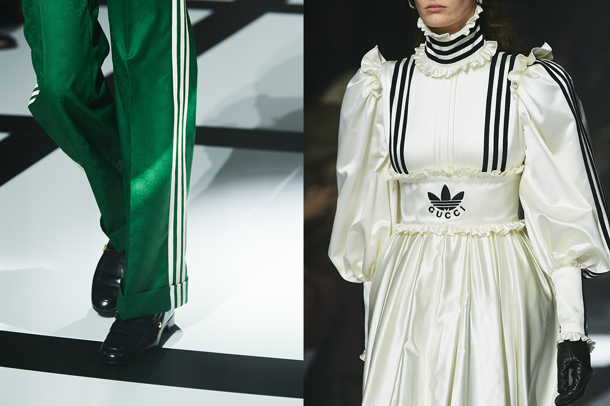 在伸展台逐一走出的模特身上,adidas 成為驚喜的特別嘉賓,品牌標誌的 Trefoil 與 Three Stripes Logo 不只是出現在帽款、鞋履等配件之上,同時也創造了本季的時裝細節,Alessandro Michele 的巧思之下,無論是無領西裝的口袋、袖口、禮服的腰身、反摺的褲腳都成為鎂光燈捕捉的亮點,再次詮釋了高級時裝與休閒風格的完美融合。